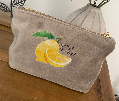 Squeeze the day Velvet make up bag Printed with a zesty lemon design